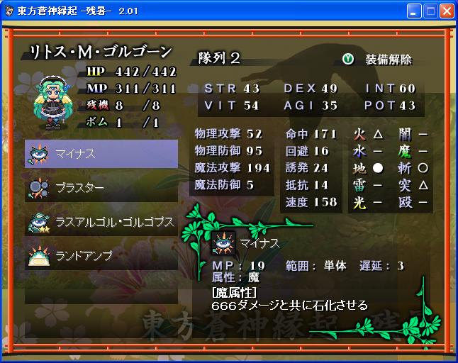 パチュリーを闇属性に特化させ、符装にアルテミスネックレス。